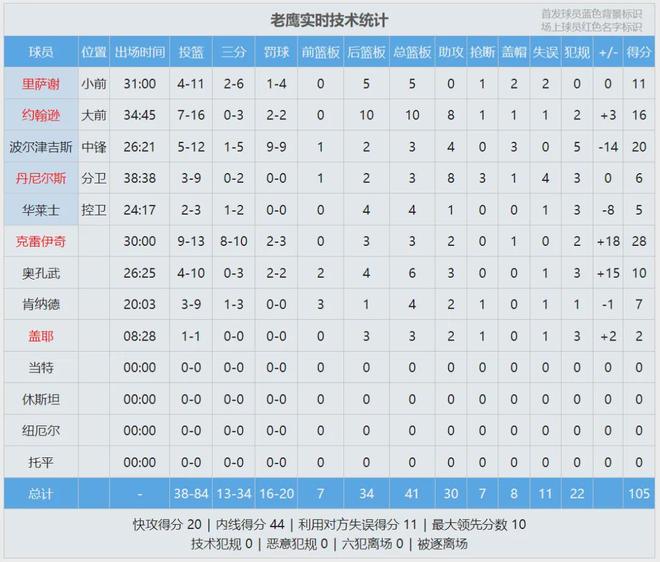 快船替补合计仅得23分,老鹰板凳球员合砍47分。老鹰球员克雷伊奇替补出战30分钟,投篮13中9,三分10中8,罚球3中2,狂砍28分3篮板2助攻1盖帽,正负值+18全场最高。克雷伊奇出生于2000年6月19日,2020年选秀的37顺位。